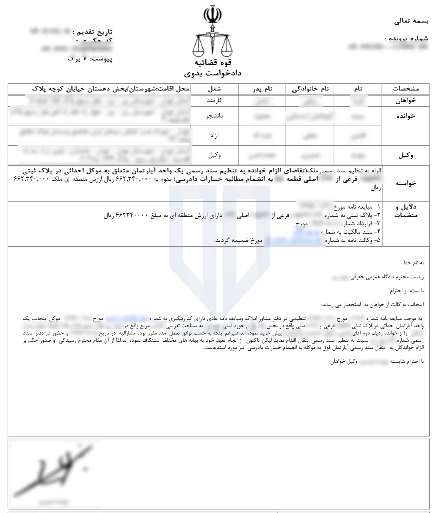 شرط اول پر كردن و تنظيم دادخواست مي باشد. دادخواست بايد بـه زبـان فارسـي و روي برگهـاي چاپي مخصوص نوشته شود.